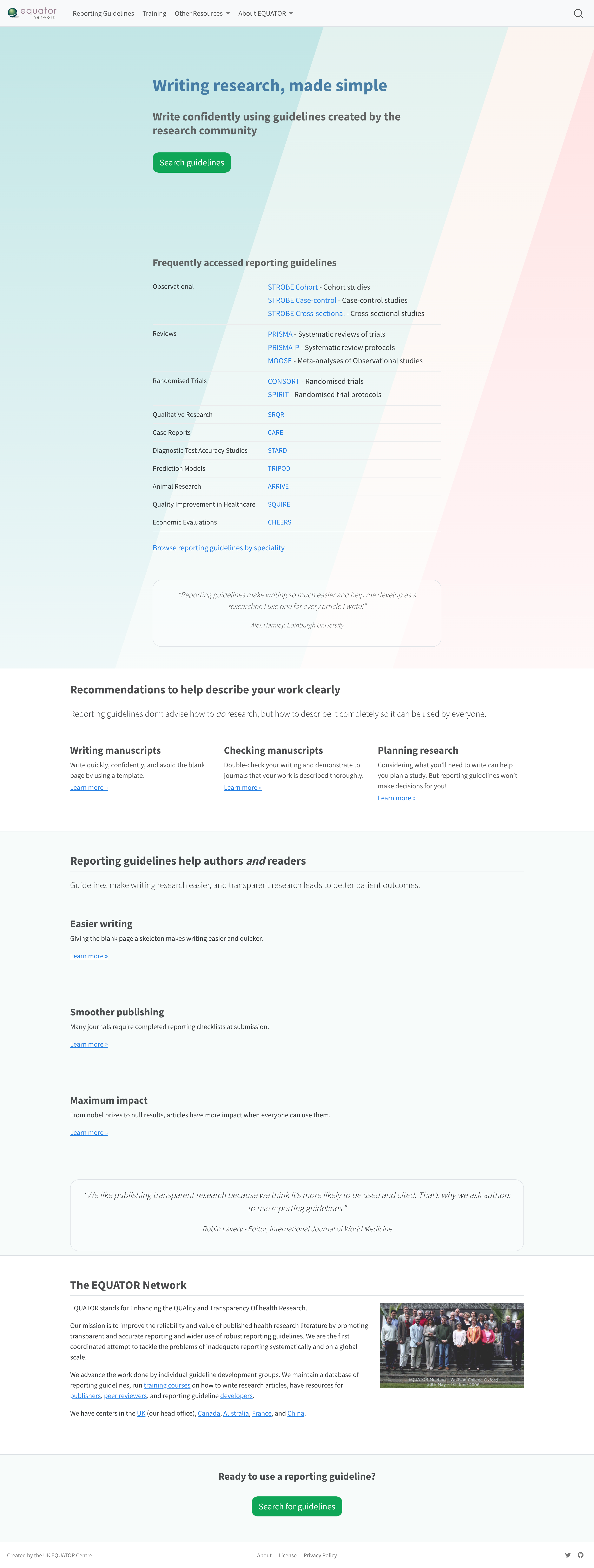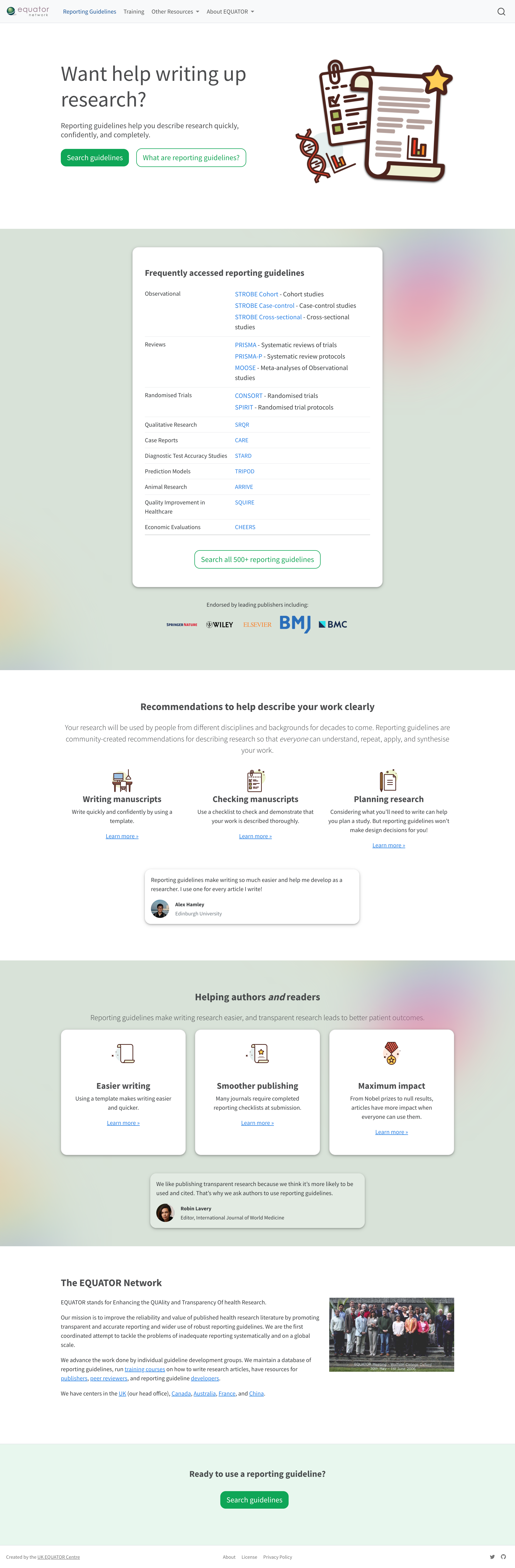 I designed these questions to explore three intervention ingredients: describe what reporting guidelines are, how they can be best used, and their benefits. These are the main ingredients featured at the top of the home page.